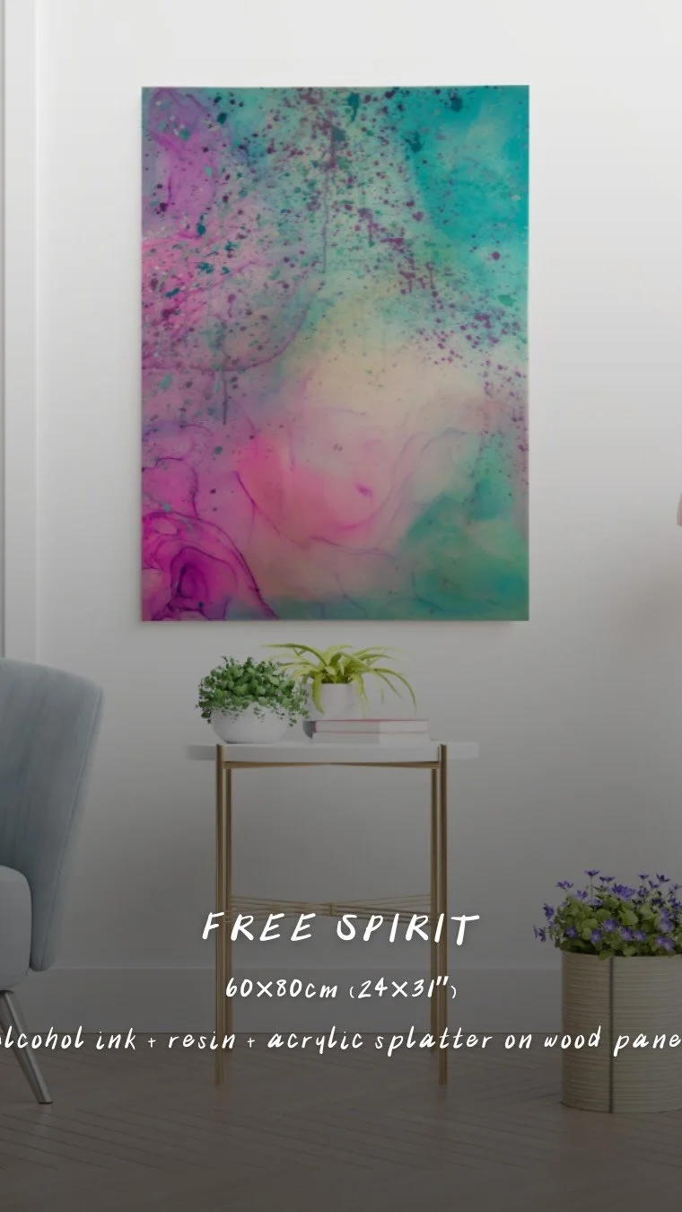 Through a fusion of alcohol inks, texture paste, and layers of resin, this collection explores the intricate dance of light and darkness within the human experience.
