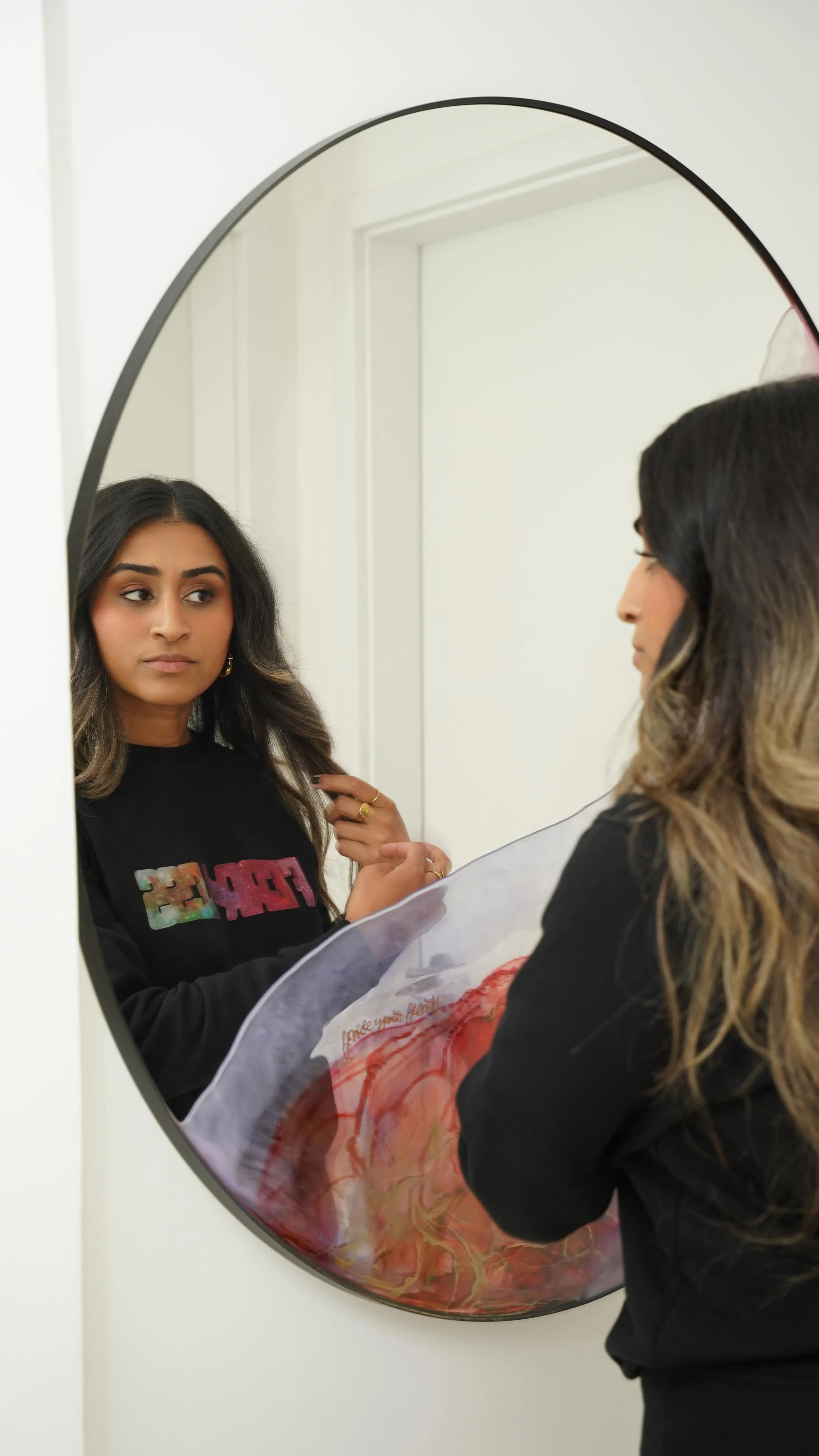 For the first time, I incorporated splattered paint into pieces like FREE SPIRIT, FAILUREāS PROTECTOR, and THE REAWAKENING, symbolizing the release of perfectionism. I ventured into sculptural art with upcycled resin scraps, crafting a unique shield in FAILUREāS PROTECTOR. I also experimented with mirrors by painting and hand-engraving on them, seen in FACE YOUR FEARS.