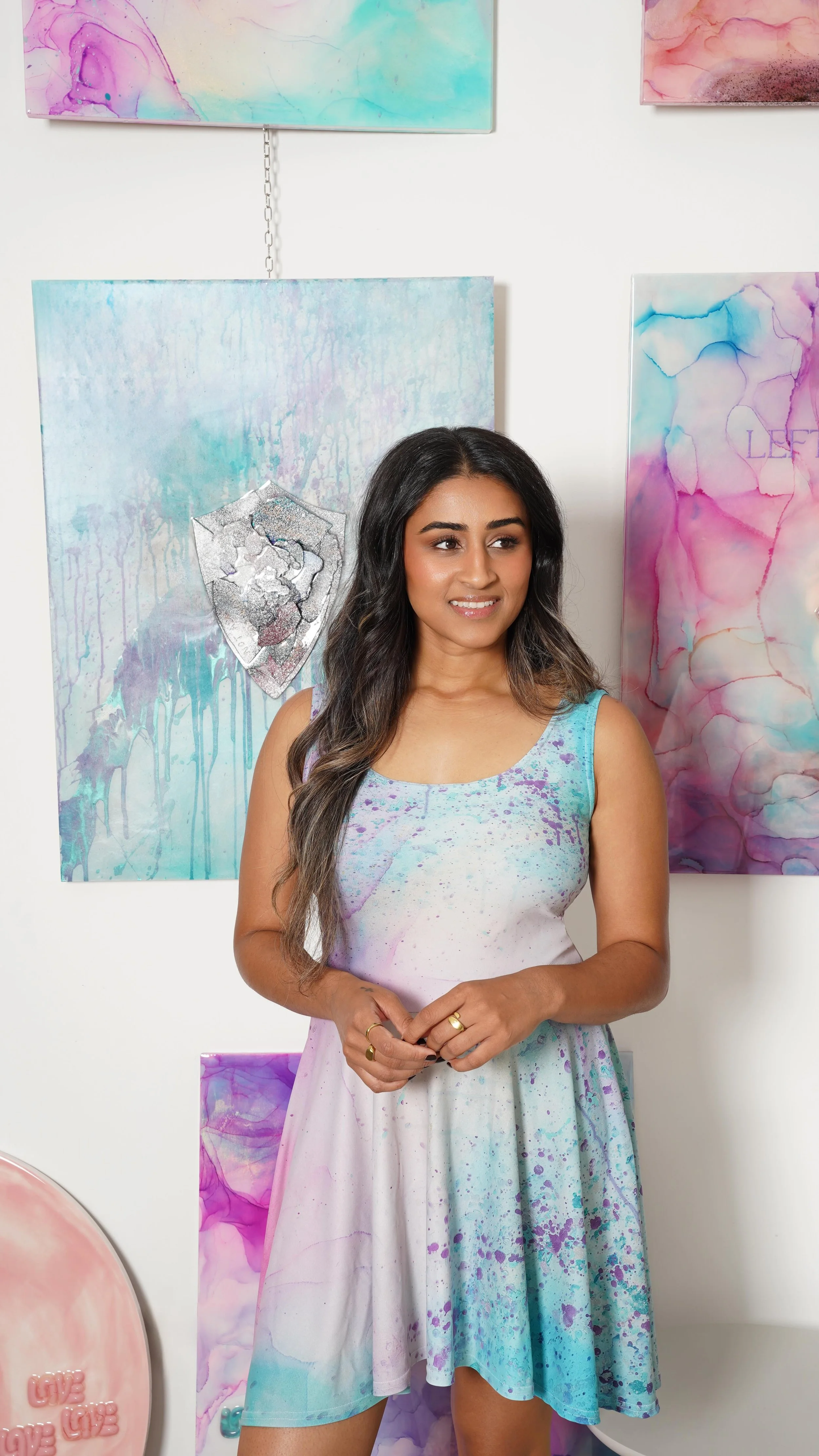 For the first time, I incorporated splattered paint into pieces like FREE SPIRIT, FAILURE’S PROTECTOR, and THE REAWAKENING, symbolizing the release of perfectionism. I ventured into sculptural art with upcycled resin scraps, crafting a unique shield in FAILURE’S PROTECTOR. I also experimented with mirrors by painting and hand-engraving on them, seen in FACE YOUR FEARS.